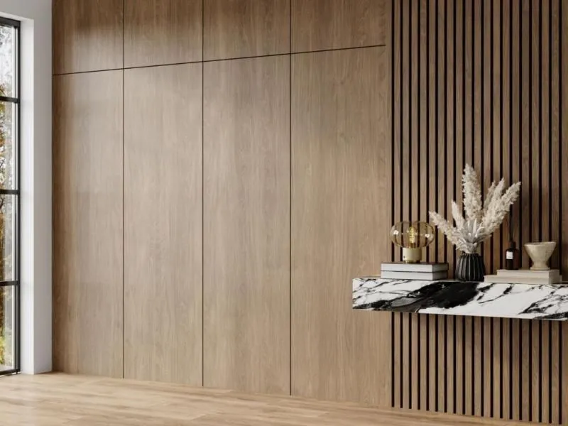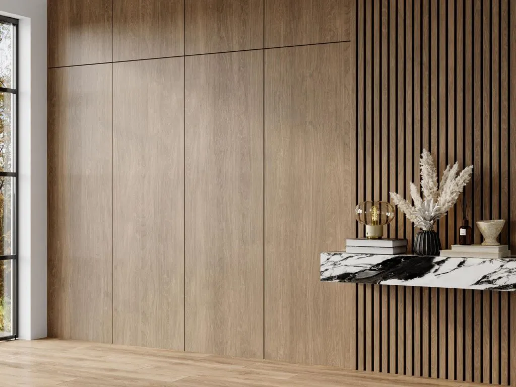 Решение: листы с текстурой натурального шпона или точной имитации дерева. Смотрится как дорогая деревянная отделка, а по цене в разы доступнее.